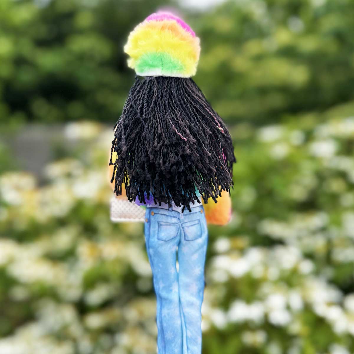 Barbie outfit regenboog met bontjas bontmuts glittertop en jeans
